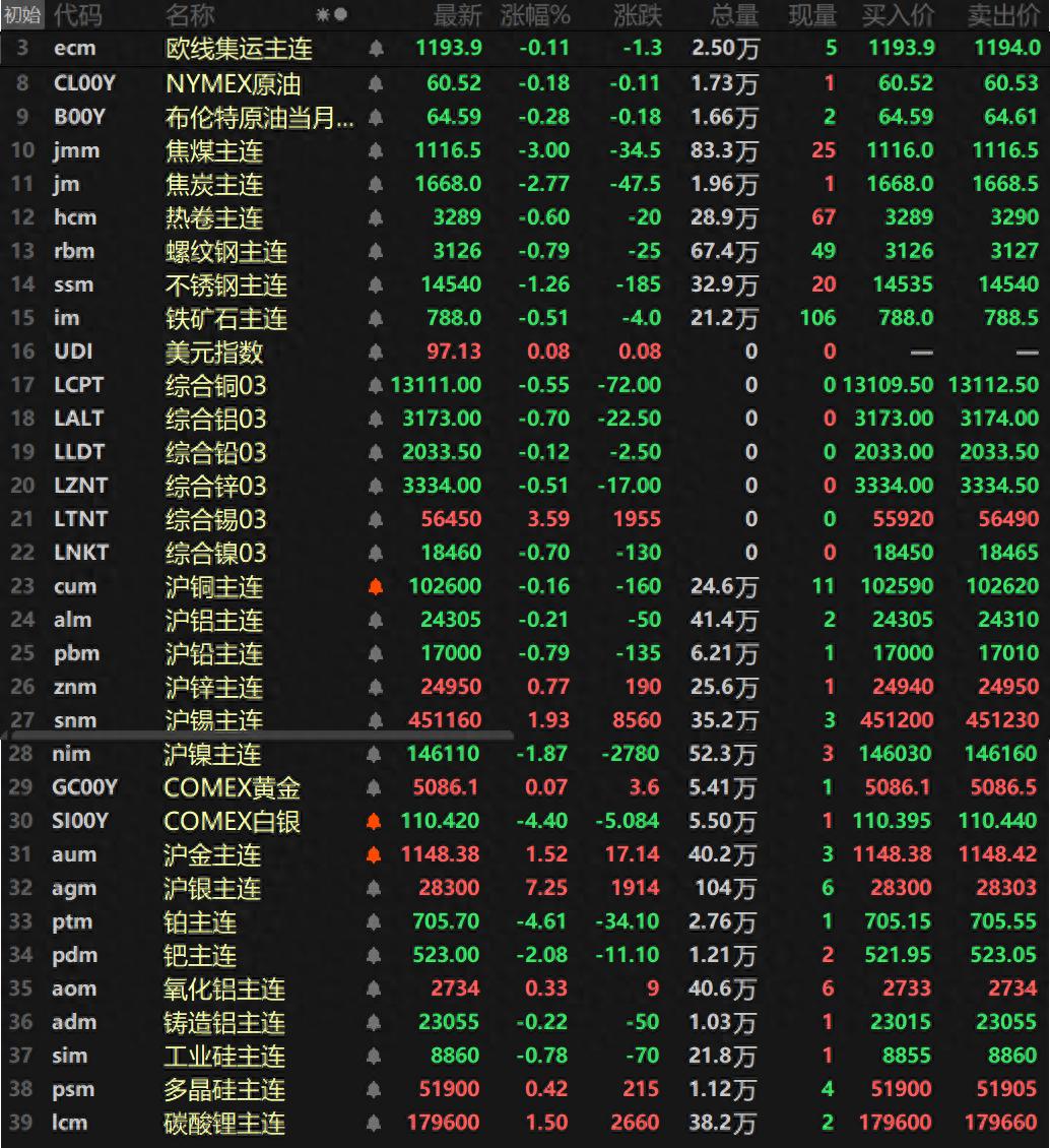 此外,碳酸锂主连涨1.5%,多晶硅主连涨0.42%,工业硅主连跌0.78%。欧线集运主连跌0.11%报1193.9。