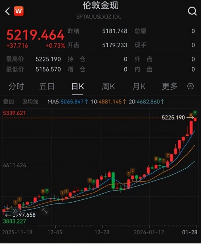 wind数据显示,1月26日,伦敦金现盘中触及5111.17美元/盎司,首次站上5000美元/盎司关口;1月27日,最高达5190美元/盎司,1月28日截至发稿前,伦敦金现最高价突破5222美元/盎司。