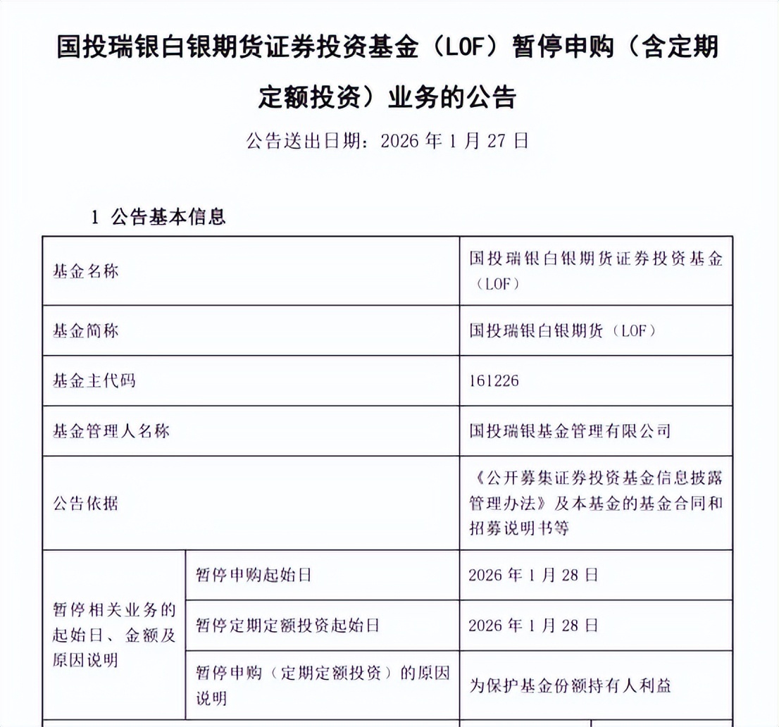 “国投白银1月28日起暂停申购了。”近期有网友在小红书上发布的这条帖子引发热议。在白银价格急速攀升之际,白银投资品为何被暂停申购?记者查询发现,该基金为国投瑞银白银期货LOF,是公募基金市场唯一一只投资白银期货的基金。根据官方公告,为保护基金份额持有人利益,1月28日起,该基金将暂停申购。专家表示,此举本质上是基金管理人在市场出现极端行情时,为保护现有持有人利益采取的风控措施。