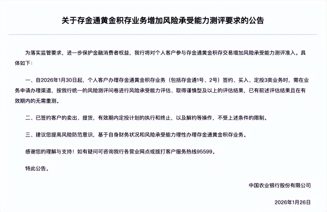 1月27日,易方达黄金主题LOF发布公告称,自1月28日起暂停A类份额的申购及定期定额投资业务,赎回业务照常办理。此外,农业银行宣布自1月30日起,个人客户办理存金通黄金积存业务(包括存金通1号、2号)签约、买入、定投三类业务时,需在业务申请办理渠道,进行风险承受能力评估、取得谨慎型及以上的评估结果。