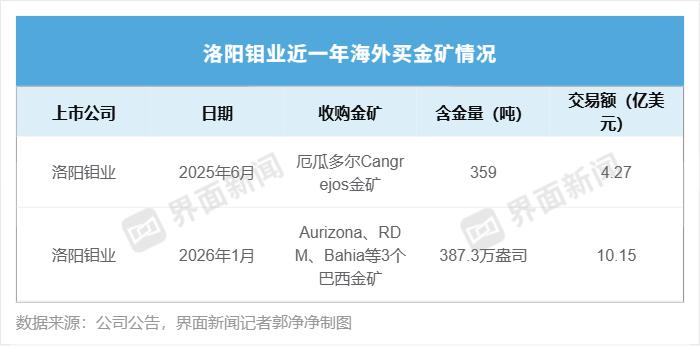界面新闻了解到,在这波金价高增行情早期,洛阳钼业、盛屯矿业等公司已展开收购动作。