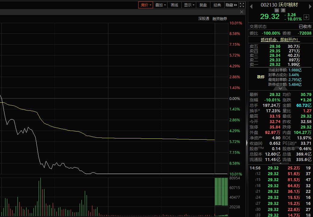 东方财富行情数据显示,在28日下午13时开盘后,沃尔核材股价在没有任何征兆的情况下“跳水”,并伴随着成交量的明显放大,并最终在13:54“封死”跌停。截至收盘,沃尔核材仍有1.99亿元的封单额,并在“跌停板”上成交了5.484亿元,全天成交60.72亿元,换手率17.23%。
