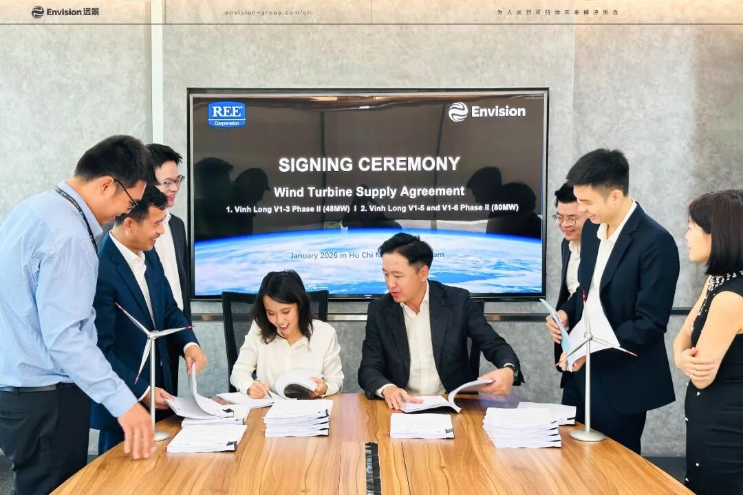 2026年1月,远景能源与REE集团在越南胡志明市正式签署128MW近海风电项目群风机供货合同,项目位于越南南部永隆省,采用16台EN-226/8.XMW海上智能风机,建成后将成为越南乃至东南亚地区单机容量最大的近海风电项目群,有力推动越南加快实现“净零排放”目标。签约期间,远景能源高级副总裁、亚太区总裁侯涛与REE集团董事长Nguyen Thi Mai Thanh就进一步深化合作进行了深入交流。