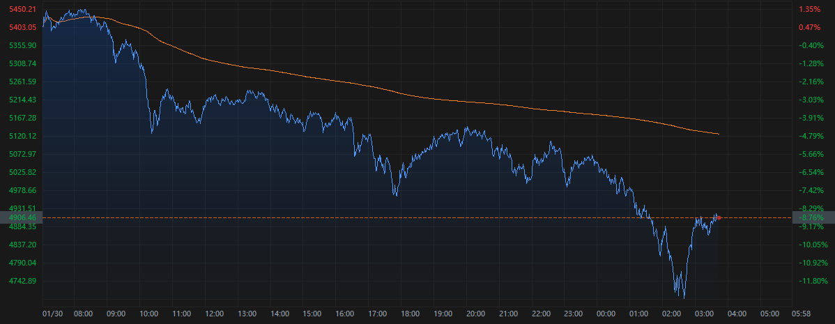 周五(1月30日)纽约时段,国际贵金属价格大幅跳水,其中现货白银一度跌超36%,黄金最高跌超12%。