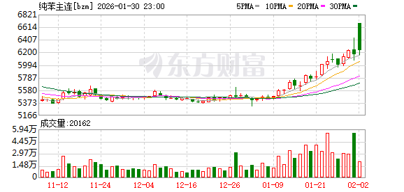 对此,卓创资讯纯苯分析师李薇表示,截至1月30日,中石化纯苯挂牌价已上调至6150元/吨,合计涨幅16.04%。截至1月30日收盘,纯苯主连期货价格报6237元/吨,整体处于高位区间,最高曾触及6434元/吨的阶段性高点。