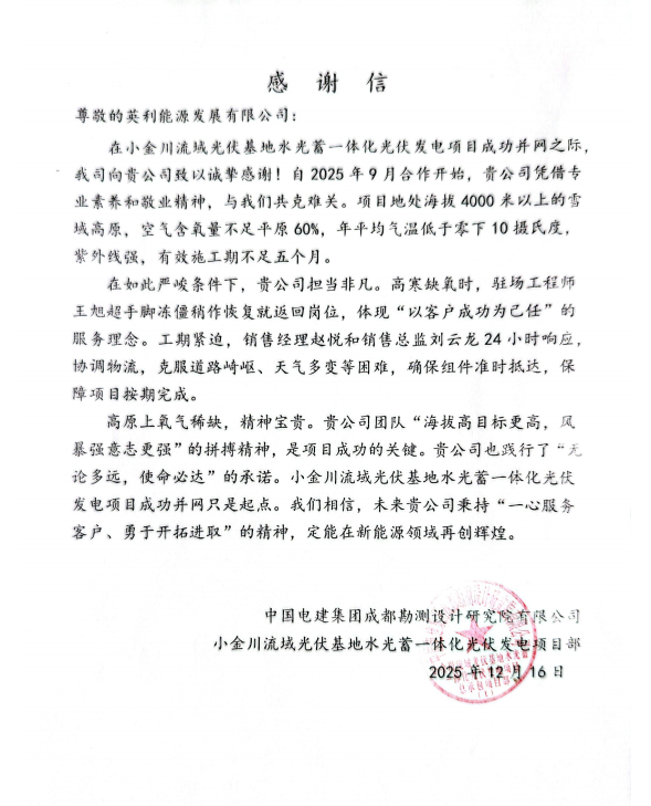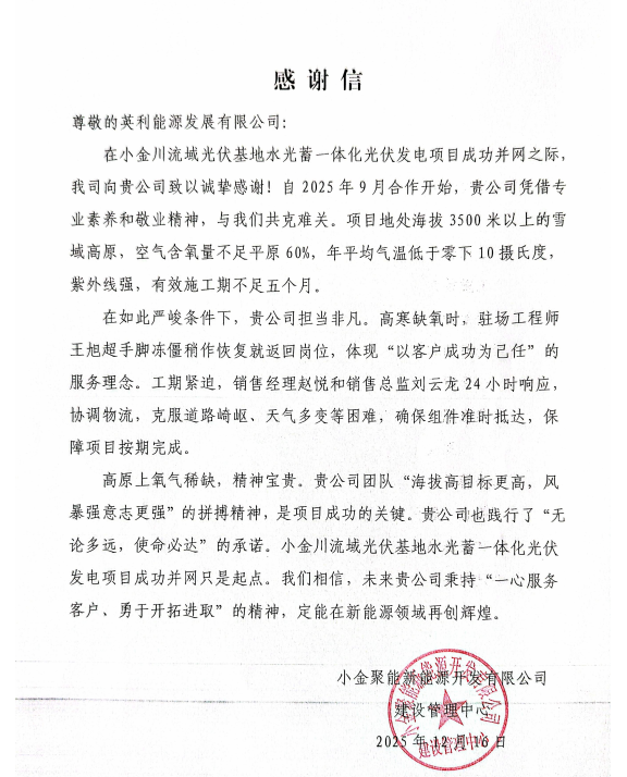 优质产品和高效服务也获得客户高度认可。项目业主方小金聚能新能源开发有限公司、项目总包方中国电建旗下中电建水电开发集团有限公司均发来表扬信;业主更赠送一面锦旗以示高度赞誉:“光伏履约守诚信 精工筑品显担当”。