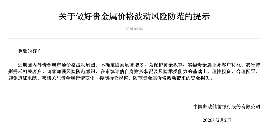 同样在2月2日,中国邮政储蓄银行也在官网发布提示信息显示,近期国内外贵金属市场价格波动剧烈,不确定因素显著增多。为保护黄金积存、实物贵金属业务客户利益,该行特别提示相关客户,加强风险防范意识,在审慎评估自身财务状况及风险承受能力的基础上,理性投资、合理配置、避免追涨杀跌,密切关注贵金属行情变化,控制持仓规模,防范贵金属价格波动带来的资金损失。