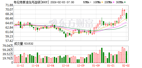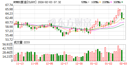 本周一(2月2日),国际油价大幅下跌,布伦特原油期货一度暴跌超5%并跌破每桶66美元;WTI原油一度大跌近6%,价格最低下调至每桶61美元附近。