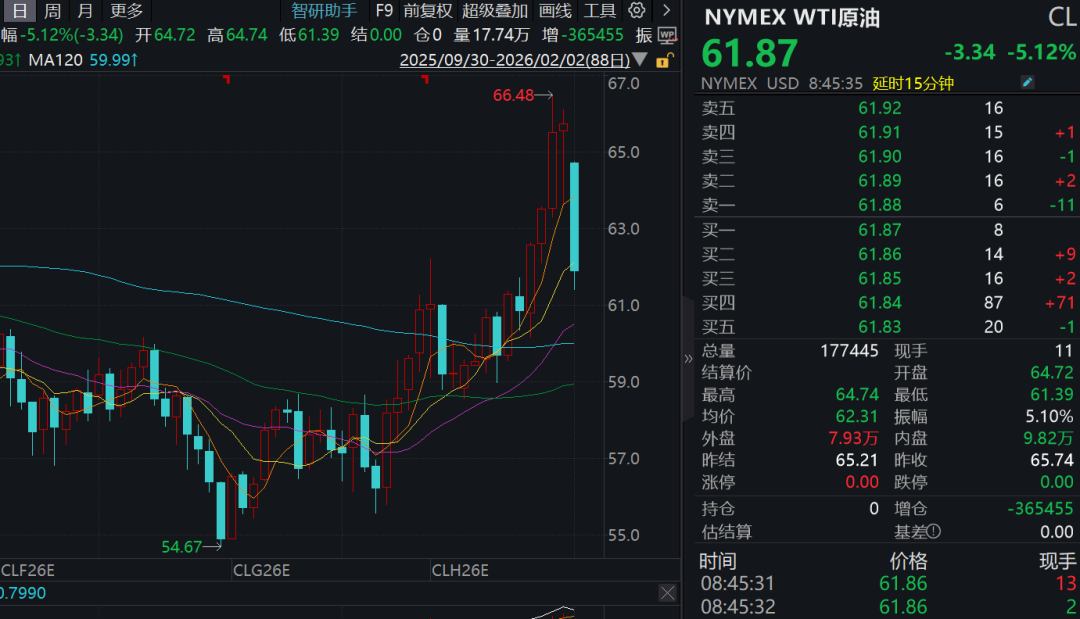 随着地缘政治风险缓和,国际原油期货价格2月2日大幅下挫,WTI原油、布伦特原油盘中跌幅均超过5%。其中,ICE布油一度跌破66美元/桶。