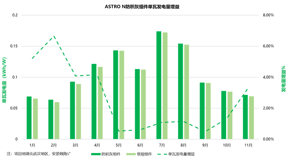 在湖北武汉的户用阳光房屋顶,2025年1月至11月的发电数据显示,相比常规组件,ASTRO N防积灰组件的单瓦发电量增益平均为2.59%,单月最高增益突破6.65%。