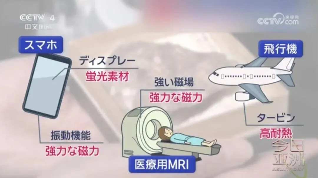 稀土元素的化学性质十分活泼,能够与其他元素结合,形成功能千变万化的新型材料。例如,智能手机的显示屏使用了发光的稀土,静音模式下的振动功能则使用了具有强磁力的稀土;需要强磁场的医用核磁共振、飞机涡轮中的耐热部件,也都使用了稀土。