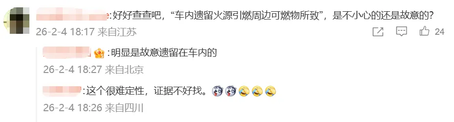 经向车主了解今日已收到认定书,该起事故系车内遗留火源引燃周边可燃物所致,非车辆自身原因产生。 网传视频中所谓的“烟花”情况,系车辆安全气囊因燃烧引爆导致,与电池等无关。我们将协助客户妥善处理后续事宜。