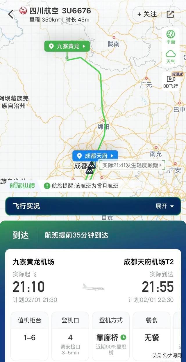 极目新闻记者在航旅纵横APP上查询到,2月1日,四川航空3U6676次航班计划21:30起飞,22:30到达。当天该航班实际21:10就起飞了,21:55分到达天府机场,比预计时间提前了35分钟。