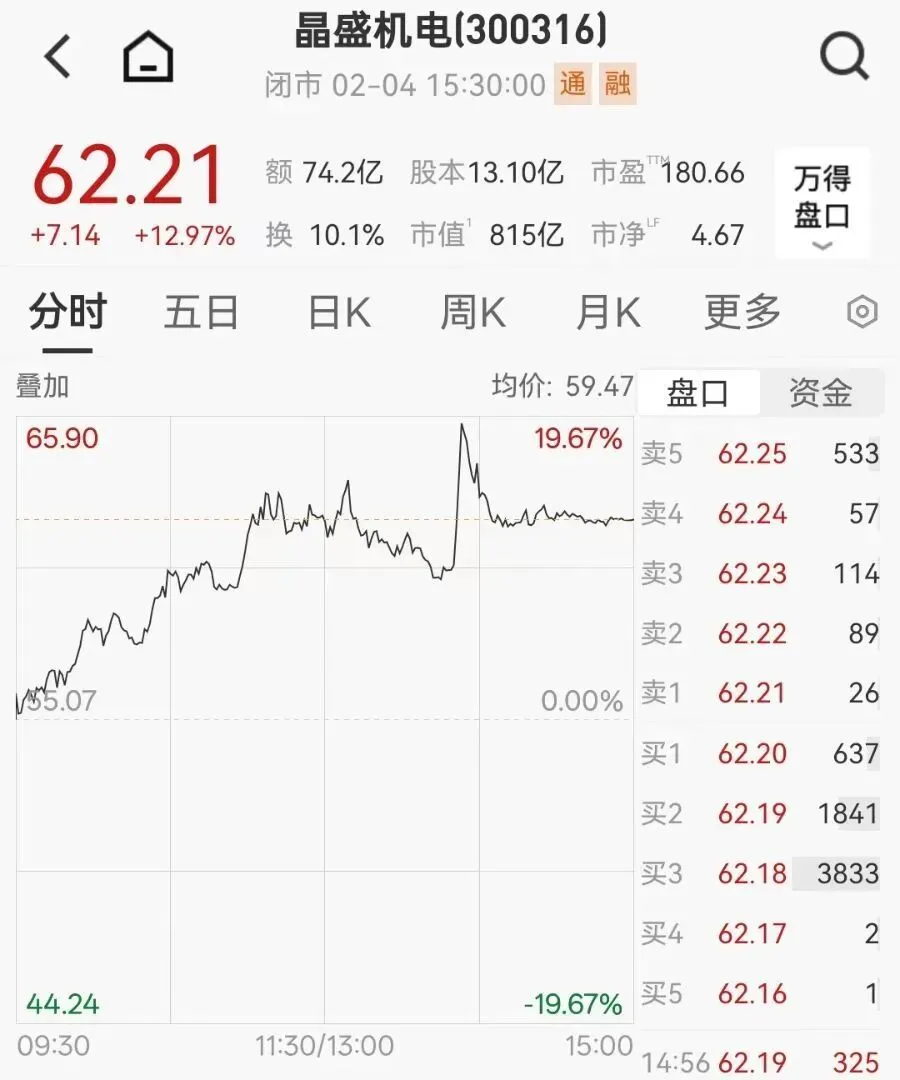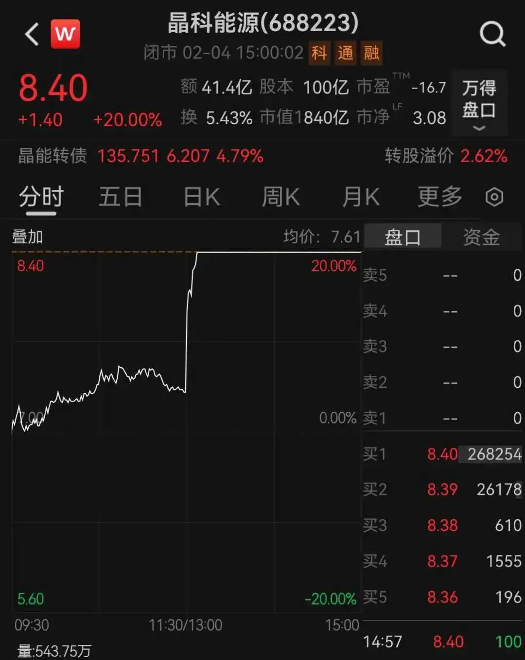 2月4日午后,光伏板块冲高,太空光伏方向强势领涨,晶科能源迅速拉出20%涨停。