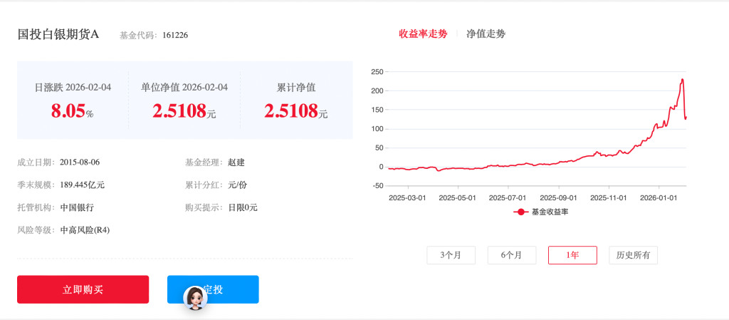 2月4日晚间,据官网披露,国投白银LOF最新单位净值为2.5108元,继上一交易日上涨3.31%后,再度上涨8.05%。