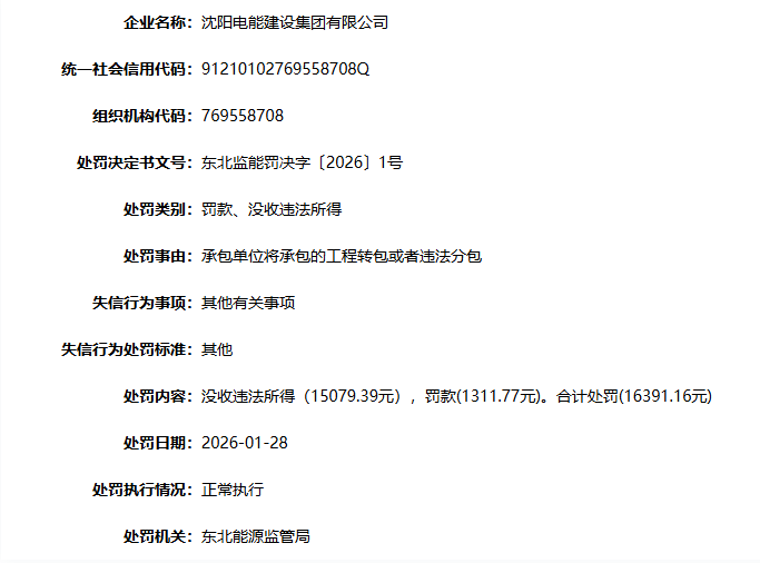 近日,国家能源局资质和信用信息系统处罚信息显示,沈阳电能建设集团有限公司因将承包的工程转包或者违法分包。被东北能源监管局处以没收违法所得15079.39元,罚款1311.77元,合计处罚16391.16元。