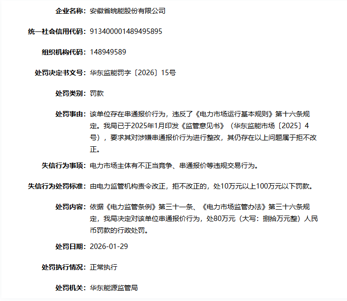 近日,国家能源局资质和信用信息系统处罚信息显示,安徽省皖能股份有限公司因存在串通报价行为,违反了《电力市场运行基本规则》第十六条规定,责令对涉嫌串通报价行为进行整改,但仍存在以上问题属拒不改正。被华东能源监管局罚款80万元。