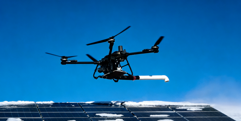 为破解传统除雪作业安全风险高、效率低下的双重瓶颈,小安到家持续推动运维工具迭代升级,构建科技化、标准化作业体系。一方面,针对不同场景配置专用除雪工具,在确保清雪效果的同时,从源头杜绝光伏组件划伤、高空作业坠落等安全隐患;另一方面,率先引入无人机搭载高速气流吹雪装置,创新实现非接触式、远距离精准除雪。