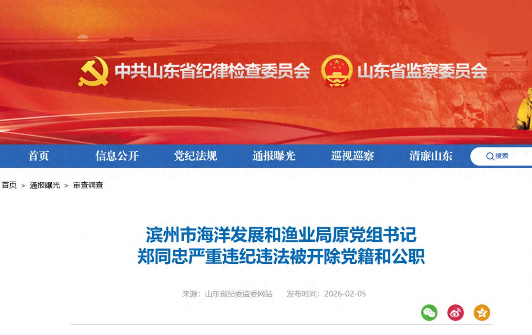 滨州市海洋发展和渔业局原党组书记郑同忠严重违纪违法被开除党籍和公职