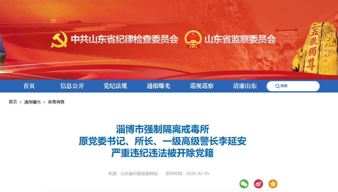 淄博市强制隔离戒毒所原党委书记、所长、一级高级警长李延安严重违纪违法被开除党籍