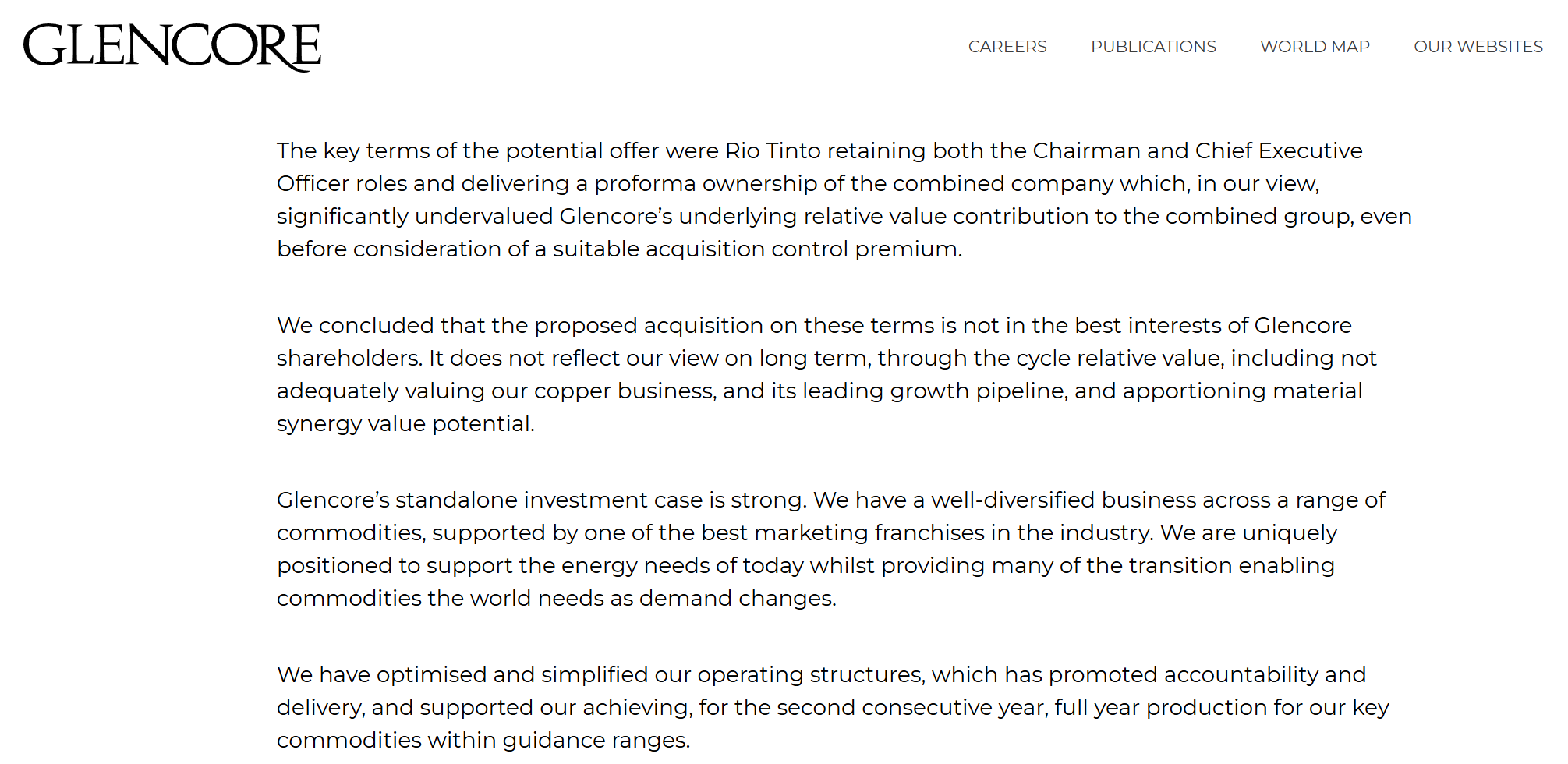与力拓简单表示“无法达成能为股东创造价值的协议”不同,嘉能可详细描述称,在拟议的合并要约中,力拓要求其董事长和首席执行官继续担任新公司的对应领导位置,同时给予嘉能可的备考持股比例,严重低估嘉能可在合并集团中的相对内在价值贡献,而且连收购控制权的溢价都没给。