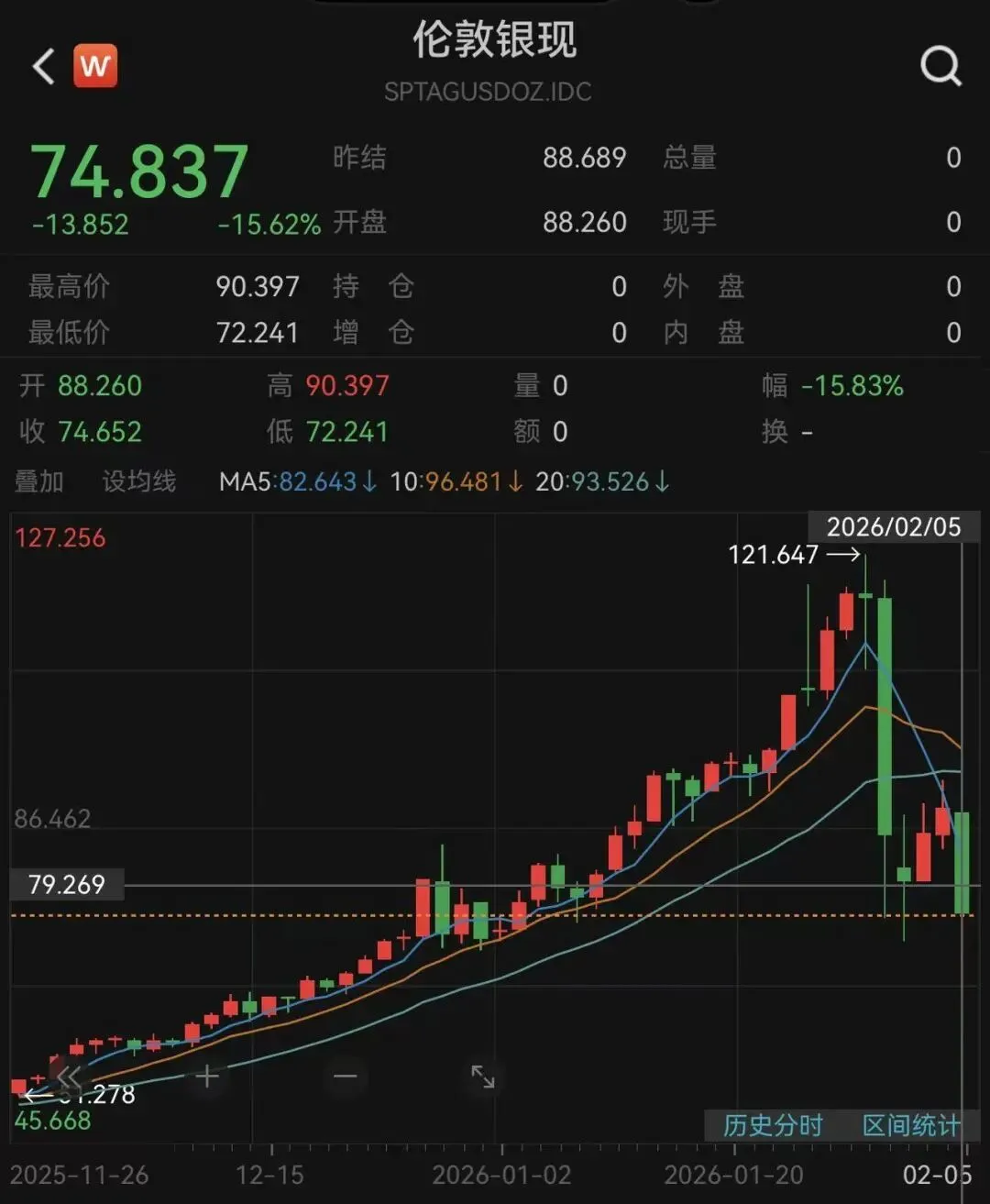 北京时间2月6日凌晨,现货白银一度暴跌18%,跌破73美元/盎司,纽约期银一度跌至14%。截至发稿,现货白银跌超15%,至74.84美元/盎司,纽约期银跌超13%至72.78美元/盎司。