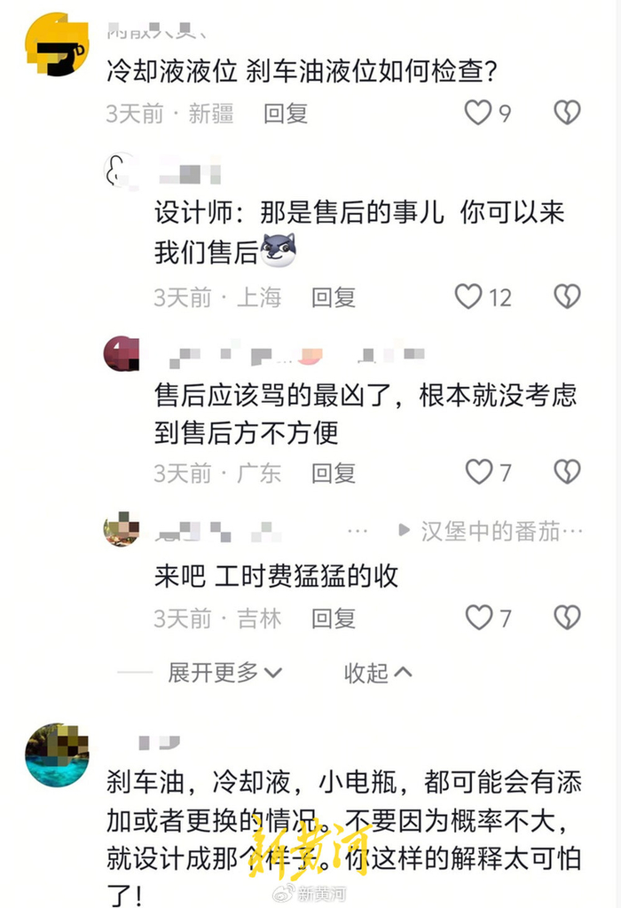 对于用户担心的异物侵入问题,设计方当时回应称,电动车停驶后不存在燃油车发动机持续余温,对小动物的吸引概率相对较低。对于这些分析,评论区一片质疑声。