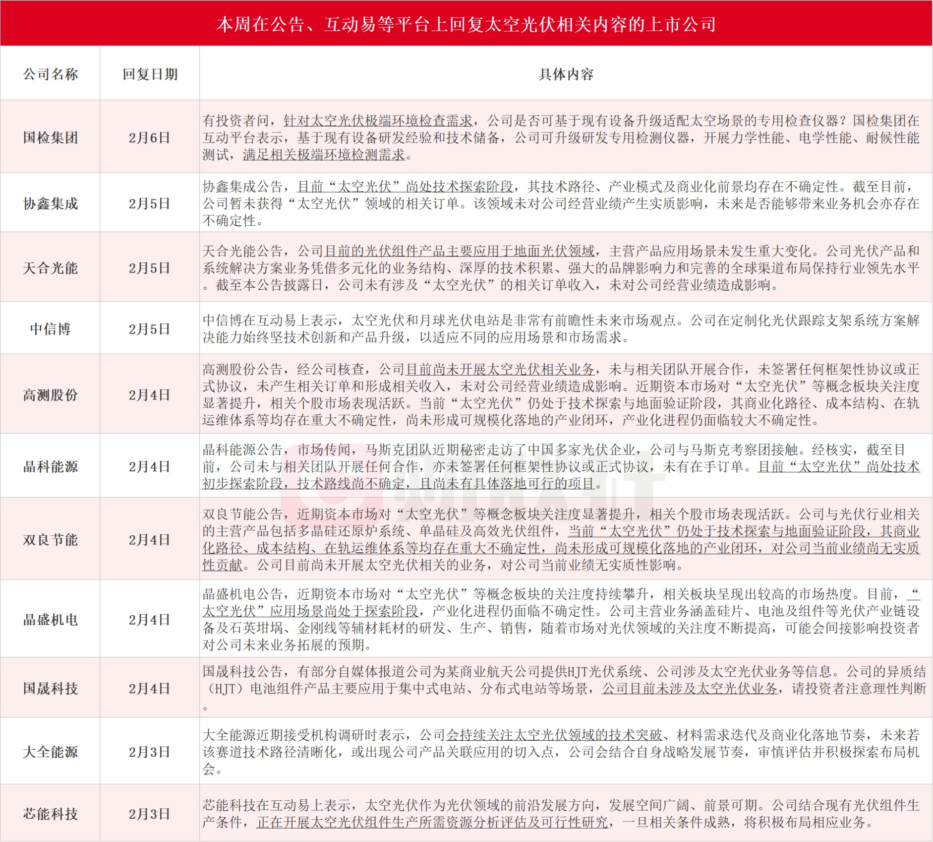 记者从多位产业链人士处获悉,马斯克团队近期“摸底”中国光伏产业链。A股方面,探索适用于外太空及空间站场景的光伏设备研发的协鑫集成周五收盘斩获三连板。据财联社不完全统计,本周包括国检集团、协鑫集成、天合光能、中信博、高测股份、晶科能源、双良节能、晶盛机电、国晟科技、大全能源、芯能科技在内的11家上市公司在公告、互动易等平台上回复太空光伏相关内容。协鑫集成2月5日公告,截至目前,公司暂未获得“太空光伏”领域的相关订单。该领域未对公司经营业绩产生实质影响,未来是否能够带来业务机会亦存在不确定性。