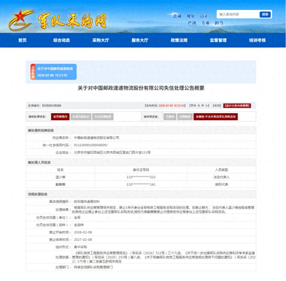 2月8日,军队采购网发布公告,中国邮政速递物流股份有限公司在军队采购活动中,存在投标提供虚假材料等违规行为。根据军队供应商管理相关规定,1年禁止全军物资工程服务采购活动的处罚。