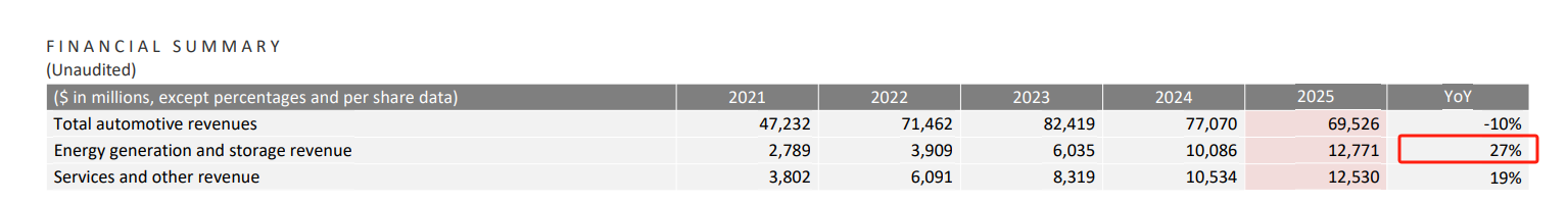 特斯拉先前发布的业绩报告显示,公司2025年能源与发电储能业务收入同比增长27%至128亿美元(2021年仅为28亿美元),电动汽车销售收入则下滑10%至695亿美元。