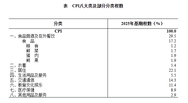 答:CPI权数是指按对比期价格购买“固定篮子”中各类商品或服务的支出占购买整个篮子所需支出的比重。权数来源以住户收支与生活状况调查中居民消费支出资料为主,部分小类和基本分类通过权数专项调查细化补充,并结合其他宏观数据、行业统计资料加以完善,确保权数客观真实反映居民消费结构。具体来看,食品烟酒及在外餐饮、衣着、居住、生活用品及服务、交通通信、教育文化娱乐、医疗保健、其他用品及服务八个大类的2025年基期权数分别为29.5%、5.4%、22.1%、5.5%、14.3%、11.4%、8.9%和2.9%。