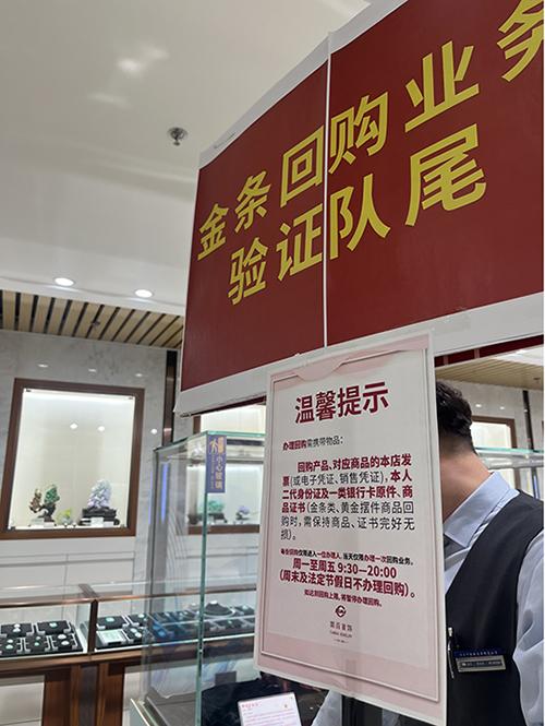 在金条回购业务队尾,一份名为“温馨提示”的告示显示,办理回购需要携带回购产品、对应商品的本店发票(或电子凭证、销售凭证),本人二代身份证及一类银行卡原件、商品证书(金条类、黄金摆件商品回购时,需保持商品、证书完好无损)。
