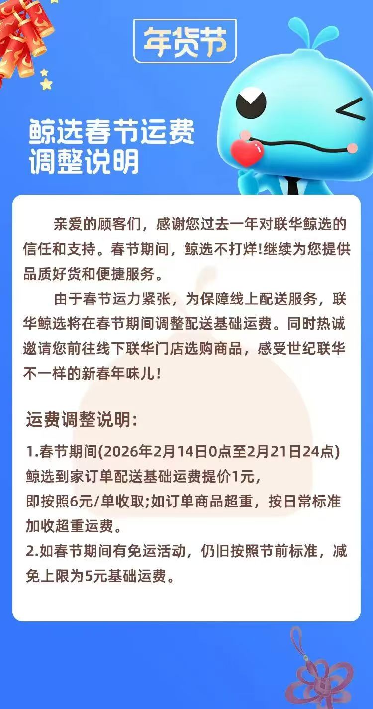 世纪联华订单基础运费将上调1元。世纪联华宣布,2026年2月14日0点至2月21日24点期间,“鲸选到家”订单基础运费将上调1元,按6元/单收取,超重部分按日常标准加收。
