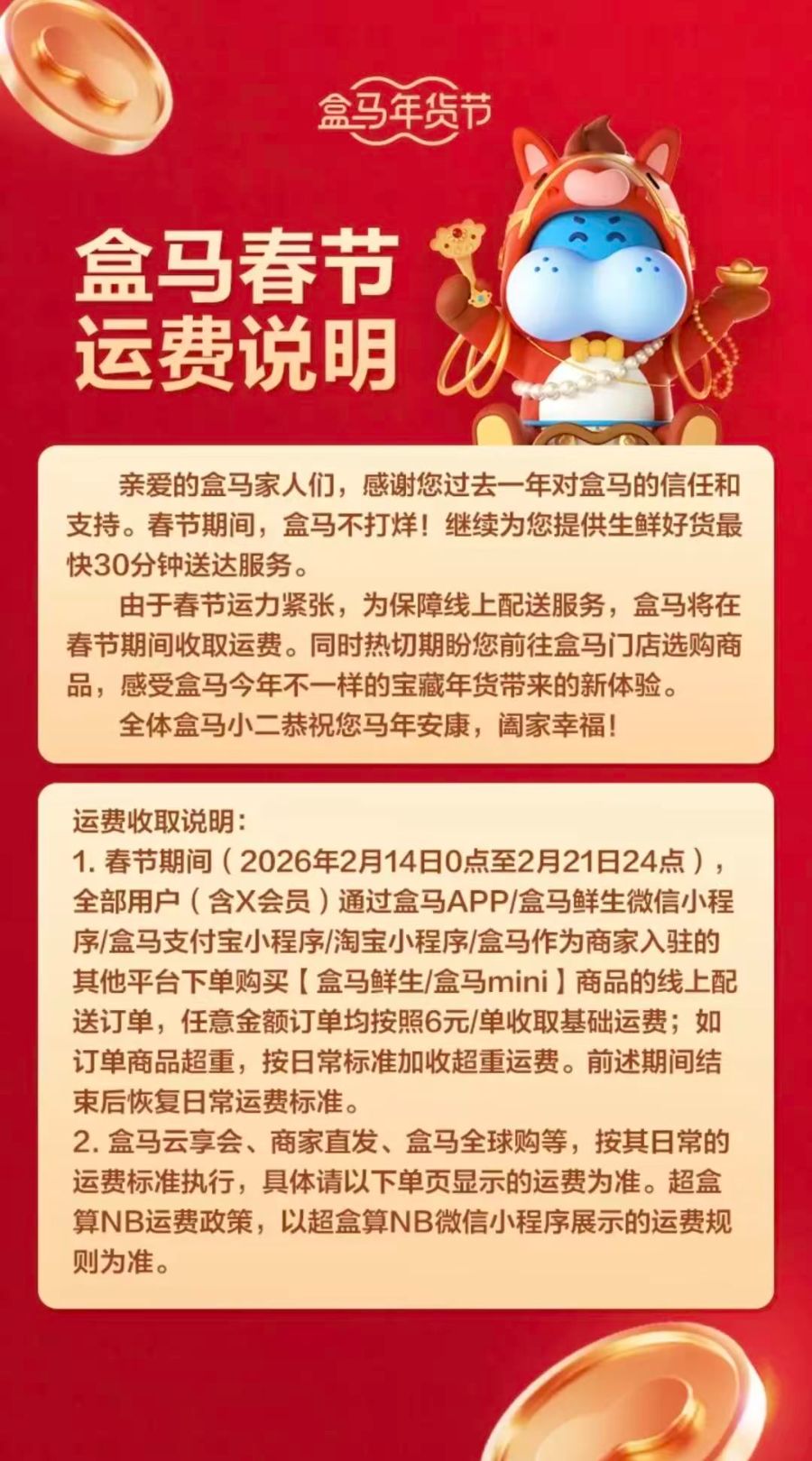 盒马每单均收6元基础运费。盒马宣布,2026年2月14日至2月21日期间,任意金额订单均按照每单6元收取基础运费;如果订单商品超重,按照日常标准加收超重运费。