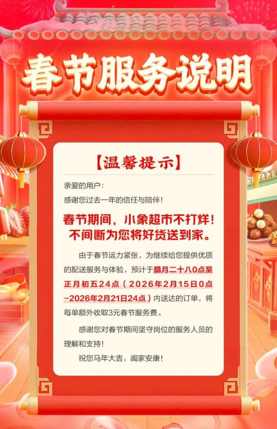 小象超市每笔订单多收3元。小象超市表示,预计于腊月二十八0点至正月初五24点(2026年2月15日0点-2026年2月21日24点)内送达的订单,将每单额外收取3元春节服务费。