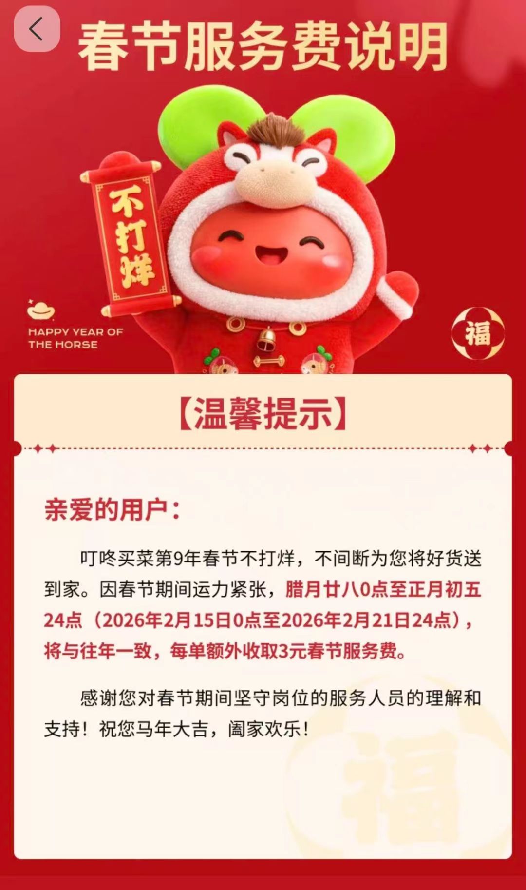 叮咚买菜每单额外收取3元。叮咚买菜表示,因春节期间运力紧张,腊月廿八0点至正月初五24点(2026年2月15日0点至2026年2月21日24点),将与往年一致,每单额外收取3元春节服务费。