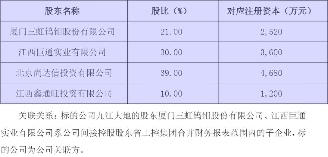 股权方面,厦门三虹钨钼股份有限公司(以下简称“厦门三虹”)、江西巨通实业有限公司(以下简称“江西巨通”)、尚达信、江西鑫通旺投资有限公司分别持有九江大地21%、30%、39%、10%的股权。其中,厦门三虹和江西巨通均为省工控集团合并财务报表范围内的子企业,九江大地因此构成厦门钨业的关联方。