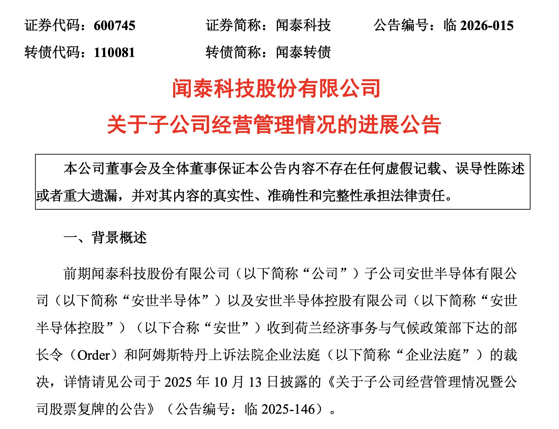 谈及业绩变动的原因,闻泰科技表示,2025年第四季度,公司子公司安世半导体有限公司以及安世半导体控股有限公司收到荷兰经济事务与气候政策部下达的部长令(Order)和阿姆斯特丹上诉法院企业法庭的裁决。