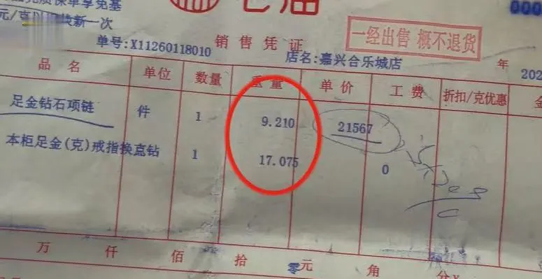 王店长解释,颜阿姨选中的项链售价21567元,单据上的“17.075克”并不是项链重量,而是用项链总价除以当日金价 ,反推需要17.075克旧金才能兑换,但项链实际只有9.21克 。