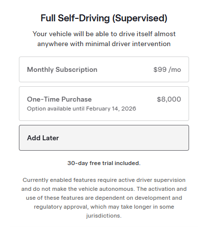 红星资本局2月15日消息,今日,特斯拉(TSLA.US)官网显示,FSD(完全自动驾驶能力)一次性买断版在2月14日截止,2月15日开始该功能仅以月度订阅形式提供。原8000美元的预付购买方式被99美元/月的订阅制取代。