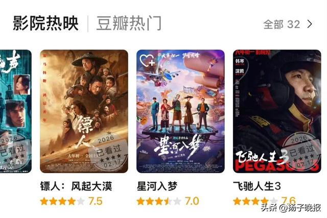 2月17日深夜,2026春节档上映的6部新片中,有3部在豆瓣开分。其中,韩寒执导、沈腾主演的赛车题材电影《飞驰人生3》,获评7.6分;吴京、谢霆锋、李连杰、于适、陈丽君等人主演的武侠电影《镖人》,获评7.5分;王鹤棣与宋茜联合主演的科幻片《星河入梦》,获评7.0分。