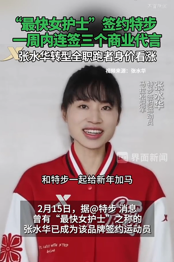 2月15日,据@特步消息,曾有“最快女护士”之称的张水华已成为该品牌签约运动员。 此外,两天前林荫大道定制板材官宣张水华为唯一形象代言人,2月10日,本土运动眼镜品牌hyperrun锐跑宣布张水华为品牌签约精英运动员。张水华离职不到一个半月,名字接连出现在三个不同行业的品牌签约名单上。