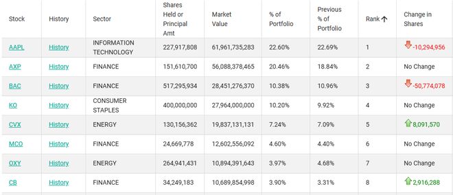 与财联社先前报道提到的一致,伯克希尔减持了苹果和美国银行,其中苹果的持股数下降了1029万股,约为Q3末的4.32%,但苹果仍是伯克希尔的最大持仓。