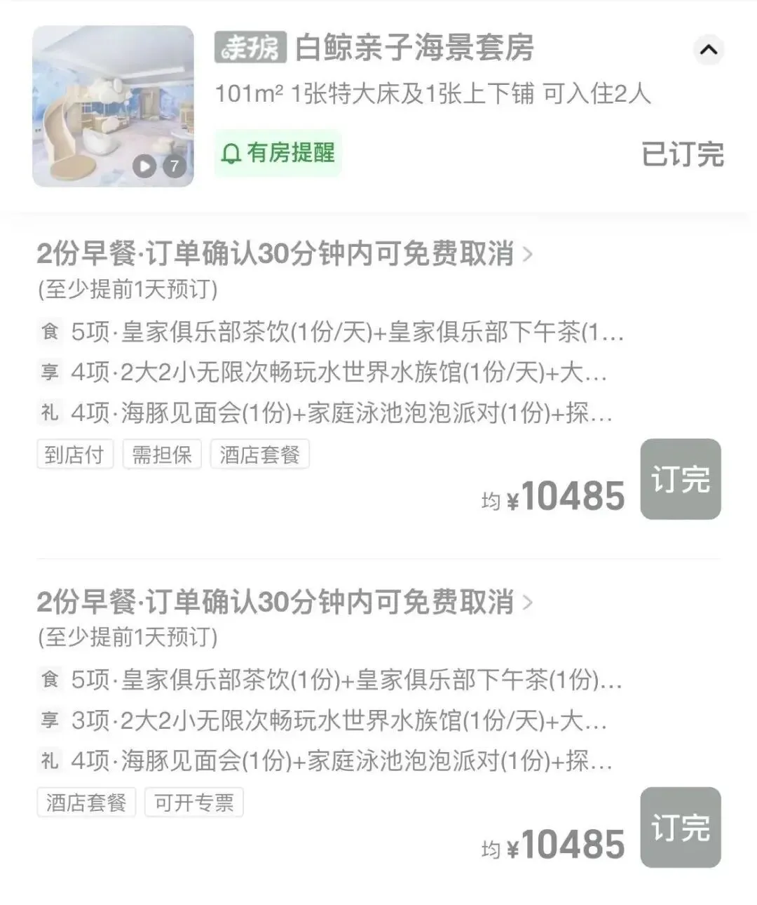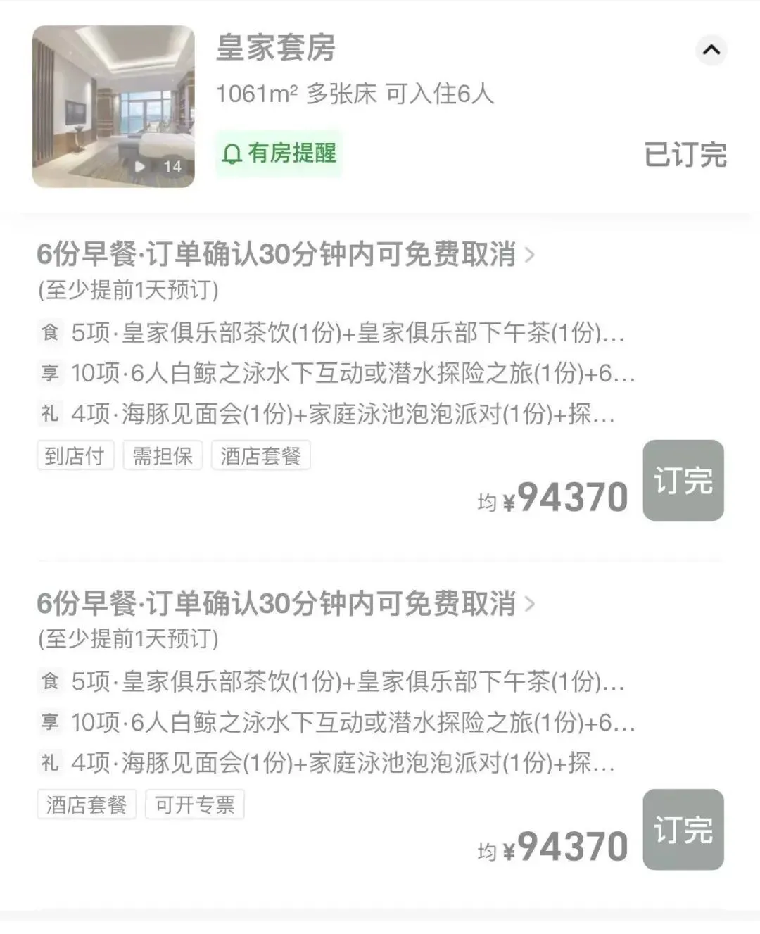 根据同程旅行小程序,2月20日至23日,三亚知名亲子酒店亚特兰蒂斯的海洋主题亲子房、白鲸亲子海景套房等均已订完,后者单价超过1万元/晚。而面积超过1000平方米、价格显示超9万元/晚的皇家套房也已订完。