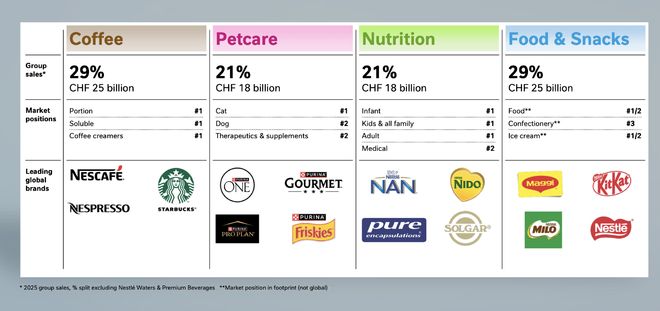 在2月19日的财报电话会上,费耐睿再次强调了绩效导向型文化。他还提到,未来雀巢集团将产品组合聚焦于四大业务——咖啡、宠物护理、营养和食品与零食,前三大业务占据了集团销售额的70%。