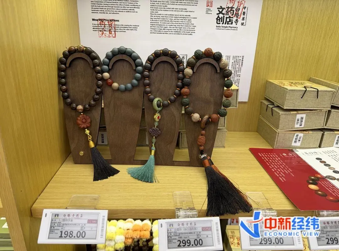 在北京白塔寺药店二楼,一边是药剂师埋头抓方子,另一边架子上摆放着不同款式的合香珠手串、合香珠手机挂绳、合香珠项链、香牌、线香等。每颗香珠都有对应的香方,人们走近能闻到阵阵药香味。合香珠制品价格在100元至600元不等,线上线下选购的消费者络绎不绝。