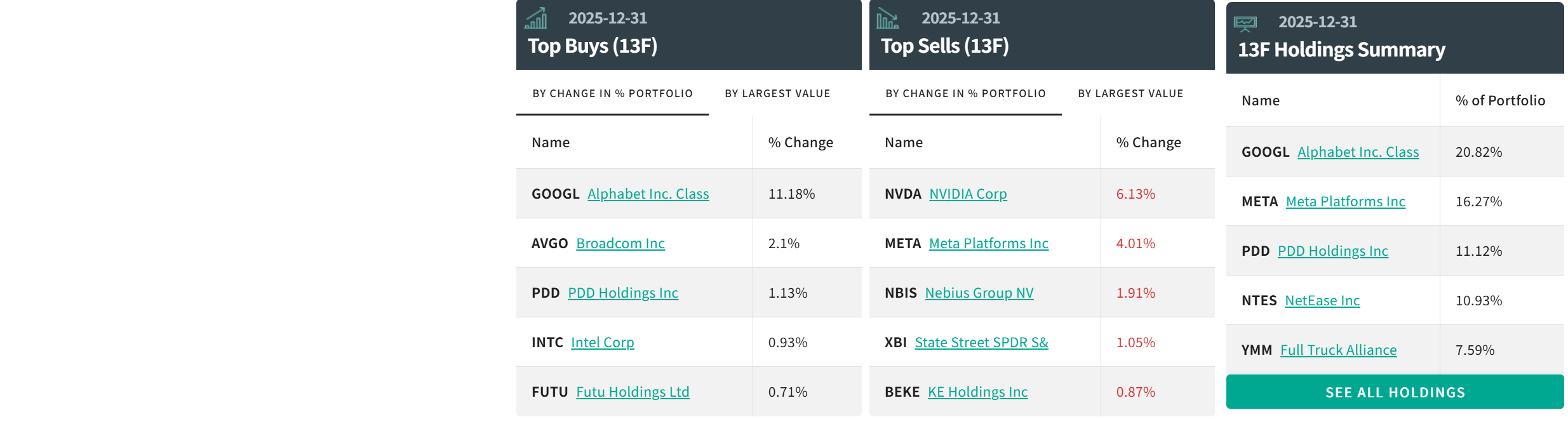 具体来看,HHLR第四季度的调仓核心聚焦中概电商龙头,拼多多与阿里巴巴构成组合“双核心”,合计占比达65%。其中,第一大重仓股拼多多获大幅增持,持仓市值12.16亿美元,占比从28%升至39%;第二大重仓股阿里巴巴持仓市值7.96亿美元,占比从14.4%大幅提升至26%。