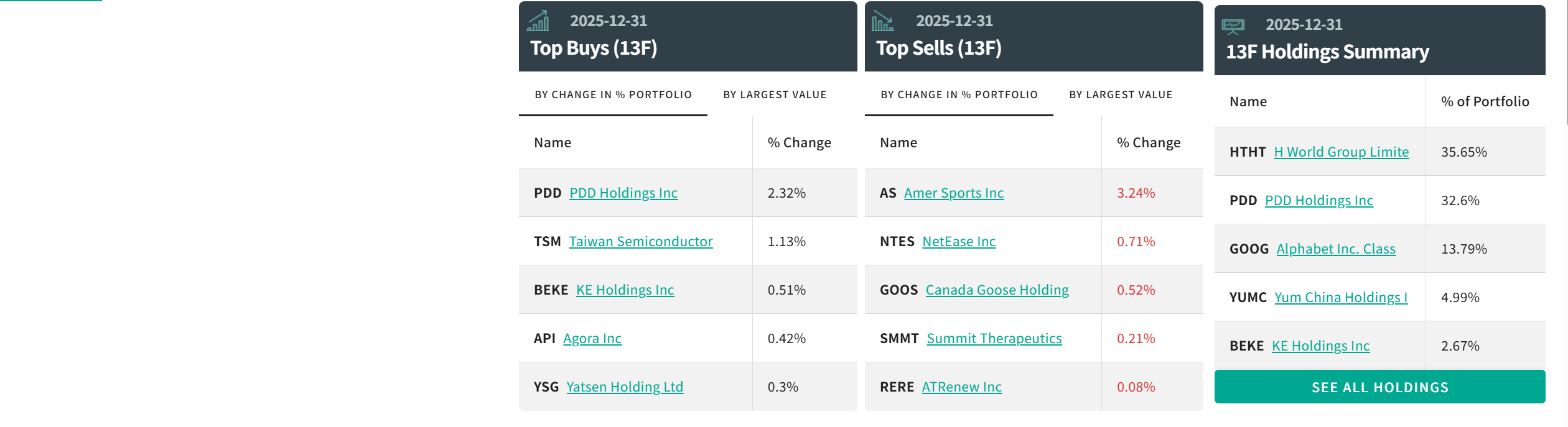 中概股仍是绝对核心,华住酒店(HTHT)以2.43亿美元持仓市值、36%的占比稳居第一大重仓股,该股四季度涨幅超20%,凸显机构对消费复苏的乐观预期。拼多多为第二大重仓股,持仓市值2.22亿美元,四季度获增持62.9万股至133.3万股,与景林、高瓴形成加仓共振。