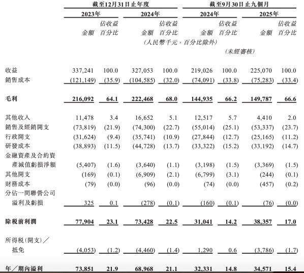 业绩方面,2023年、2024年及2025年前九个月(下称报告期内),公司实现总收益分别为3.37亿元、3.27亿元和2.25亿元;净利润分别为7385万元、6897万元和3457万元。