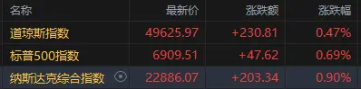 截至收盘,道琼斯指数涨0.47%,报49625.97点;标普500指数涨0.69%,报6909.51点;纳斯达克综合指数涨0.9%,报22886.07点。